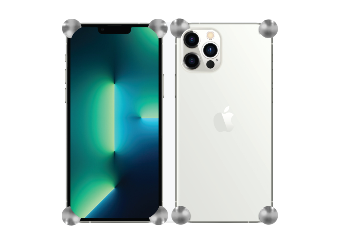 BRIGHT SILVER Original Minimalist Corners4 for iPhone 13, 13 Pro & 13 Pro/Max. Redesigned and engineered with front-facing cut-outs to allow a full view of the iPhone 13’s edge to edge screen… One set of 4 precision-machined aircraft-grade aluminum Corners with hard-anodized BRIGHT SILVER finish. Included: two 2 sets of engineered 3M adhesive strips, alcohol cleaning pad, 3M primer, and instructions.