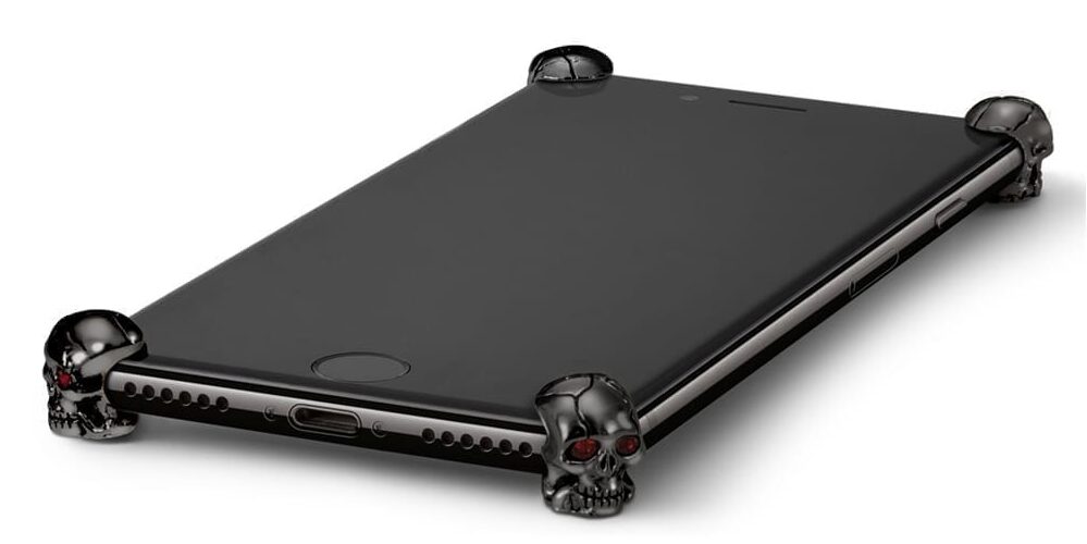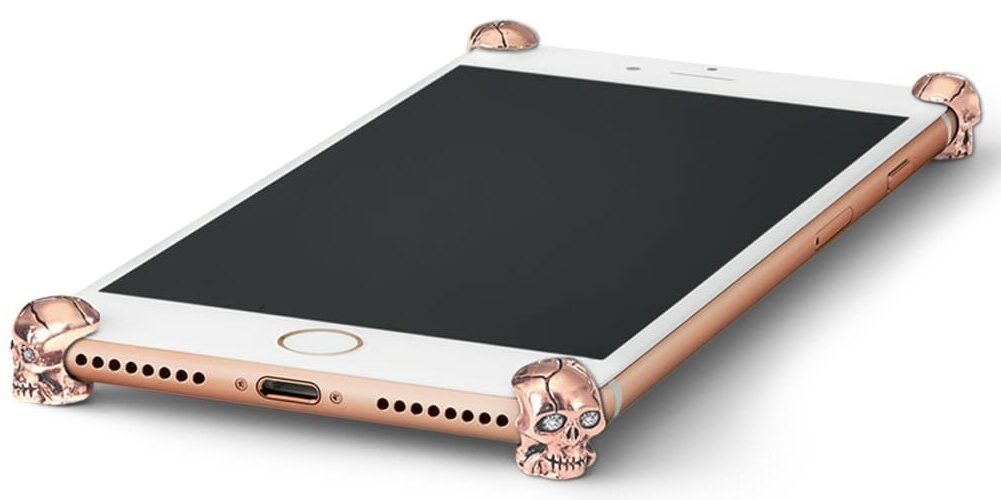 ROSE GOLD “SKULL” ICONS for iPhone X, Xs, Xs Max. 4 hand cast Skull Corners4 ICONS..finished with hardened e-coat plating and handset Swarovski crystal eyes. Included – 3 sets of 4 custom adhesives, alcohol-cleaning pad and instructions..